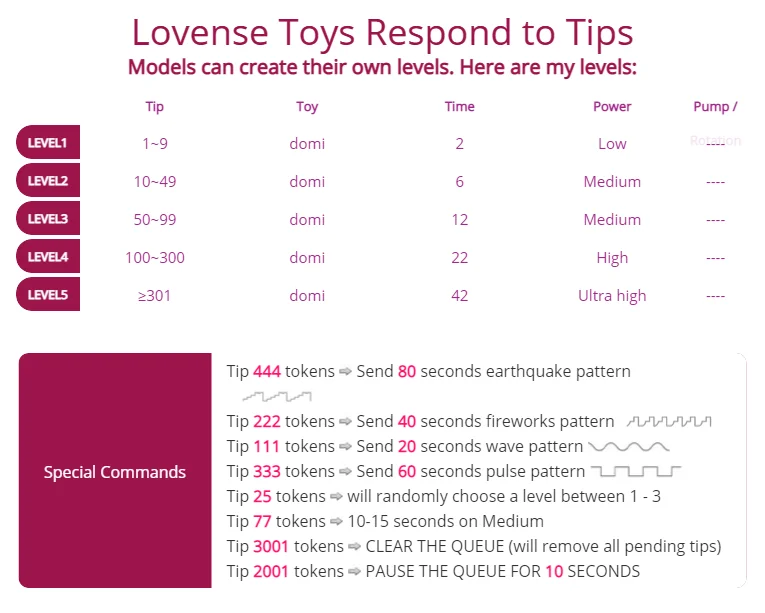 Ahegao, Cameltoe, Korset, Handjob, Massage, Meesteressen, Kantoor, Spanking, Striptease, Twerken, Rokje omhoog, Topless, Pijpen, Op z'n Hondjes, Dirty Talk, Voetfetisj, Footjob, Vernedering, Aftrek opdracht, Latex, Masturberen, Tepelklemmen, Nylon, Olie show, Anaal, Deepthroat, Dildo of vibrator, Erotische dans, Cuckolding, Vingeren, Squirten, Seksspeeltjes, Rollenspel, Orgasme, Leer, Hakken, Dubbele penetratie