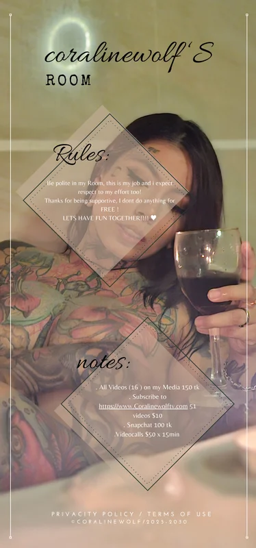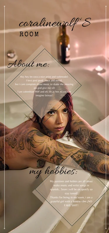 Hey hey Im cora a nice artist and webmodel. i love post punk , rock and metal. but i cant complain about music to shake the amazing ass god give me xD I am colombian Milf and ofc im as hot as you can imagine latinas! Love Tattoos and Anime My passions and hobies are all about make music and write songs in spanish.. Soon i will be on spotify so stay tuned! Thanks for being in my room, i am a grateful girl with a honest vibe ¡NO FAKE SHIT! mY IG IS @coralinewolftv I hope my dreams come true and also yours ♥ ⭐Promo ! . All Videos (16 ) on my Media 150 tk . Subscribe to https://www.Coralinewolftv.com 51 videos $10 . Snapchat 100 tk .Videocalls $50 x 15min ⭐